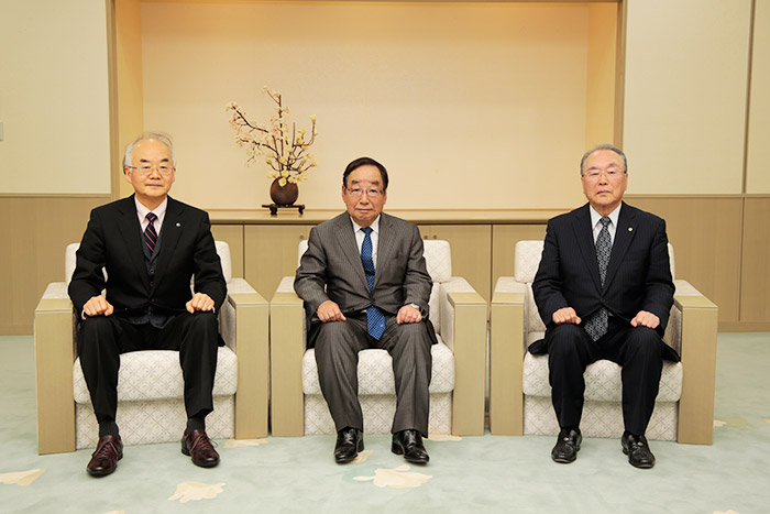 富岡賢治 高崎市長、原浩一郎 商工会議所会頭、登坂正一 太陽誘電代表取締役社長